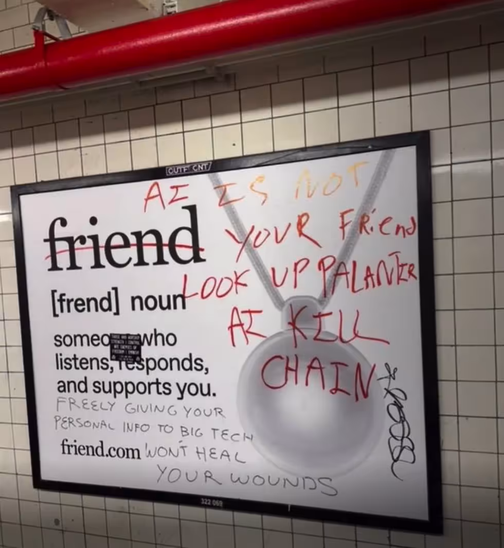 Acerca de la vandalización de su propuesta, el creador de Friend se ha mostrado muy positivo y ha declarado: “El capitalismo es el medio artístico más grande”.