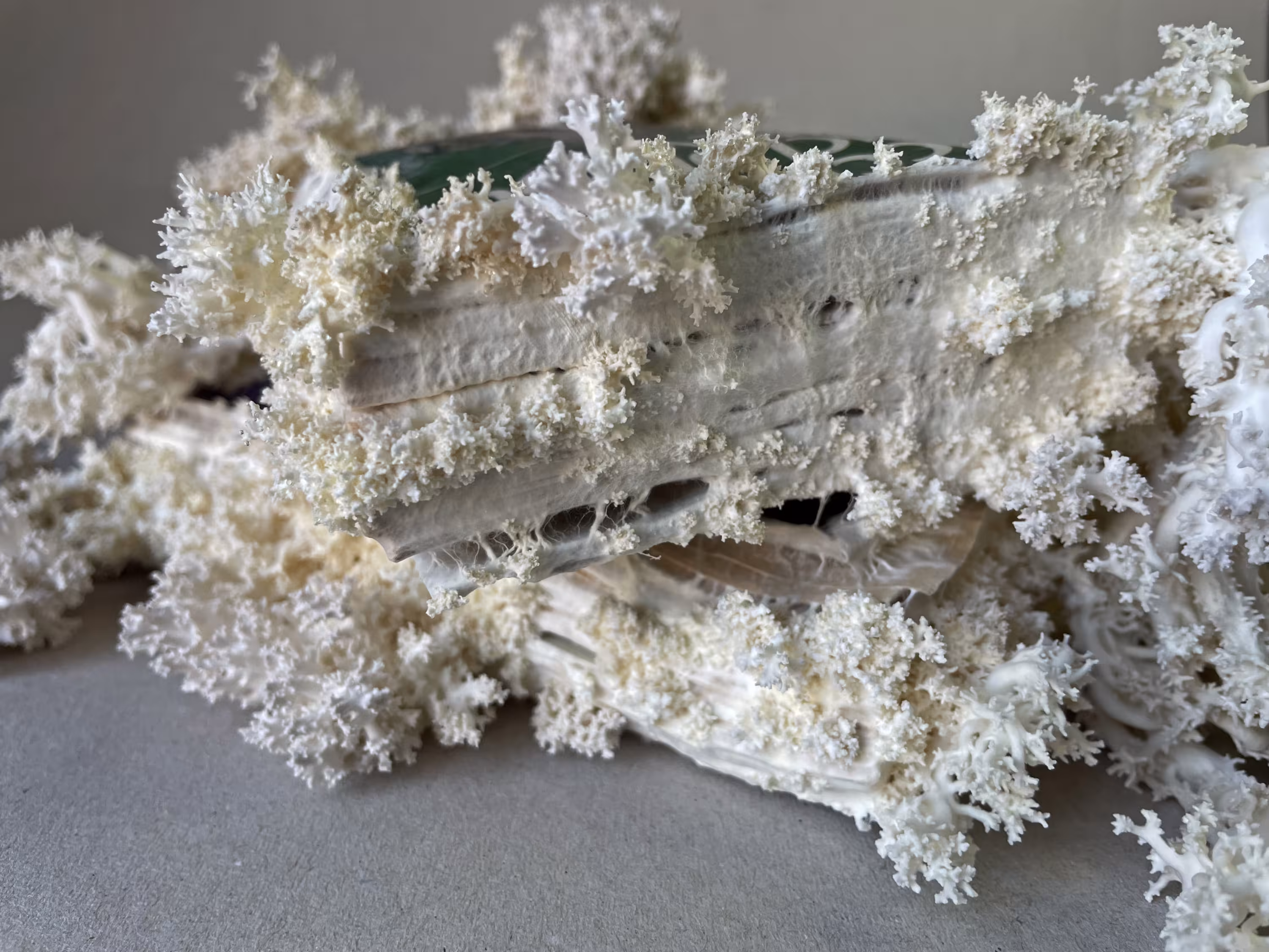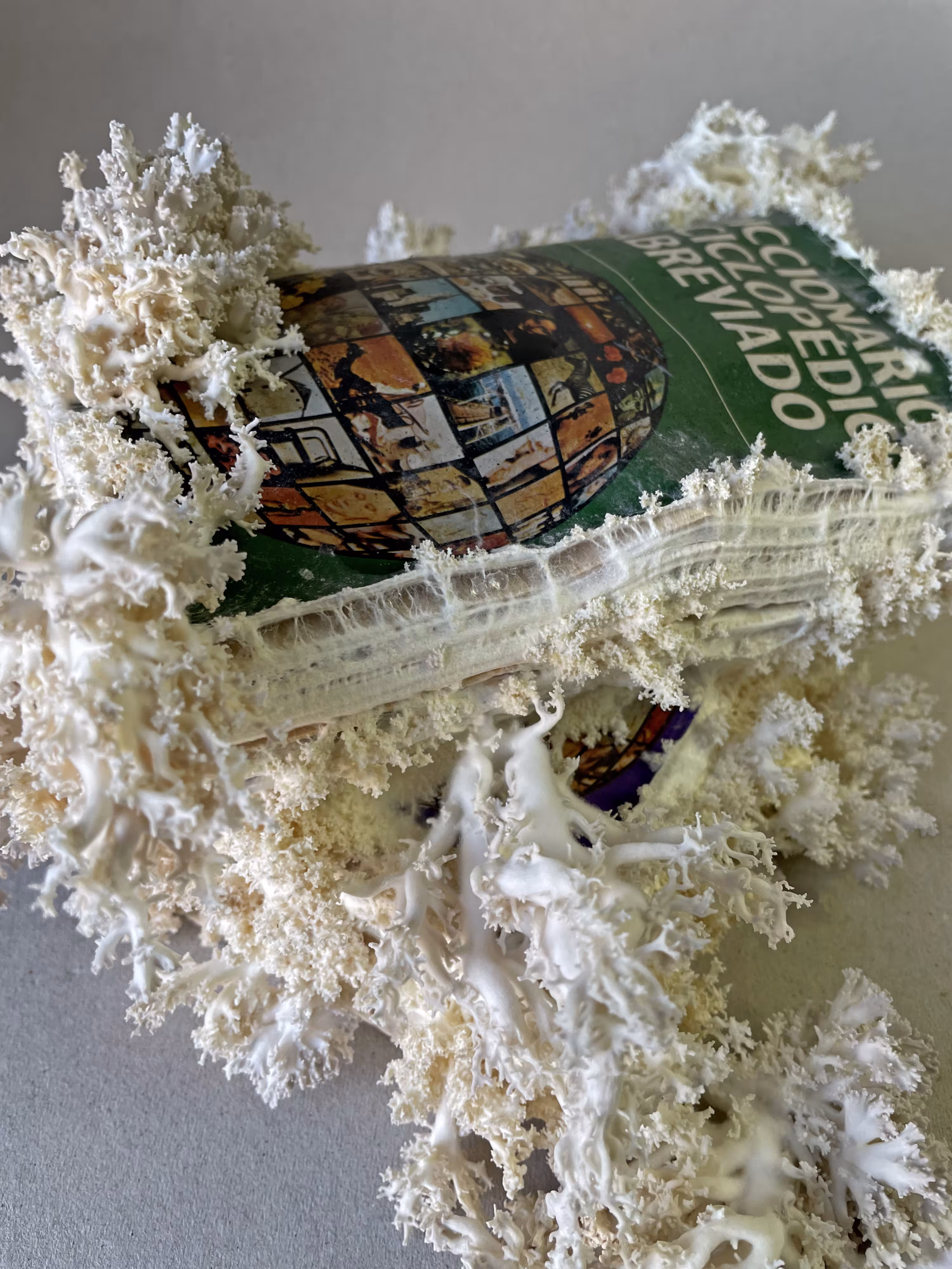 Primero fueron los dos grabados, que plantean la imagen de unas bibliotecas destruidas como un escenario distópico, sin explicar las causas, invitando a preguntarse qué ha ocurrido para que esas catedrales del saber hayan llegado a ese estado y qué le ha pasado a la sociedad que creía en esos archivos. Todas esas ruinas. Después fue el texto, ese cuento que ensaya sobre otras formas de almacenar la información, de viralidad, de memoria. Finalmente llegaron esos libros con hongos, esa simbiosis entre dos formas de conocimiento. Tres fases, en tres lenguajes, de una misma exploración de escenarios posthumanos.